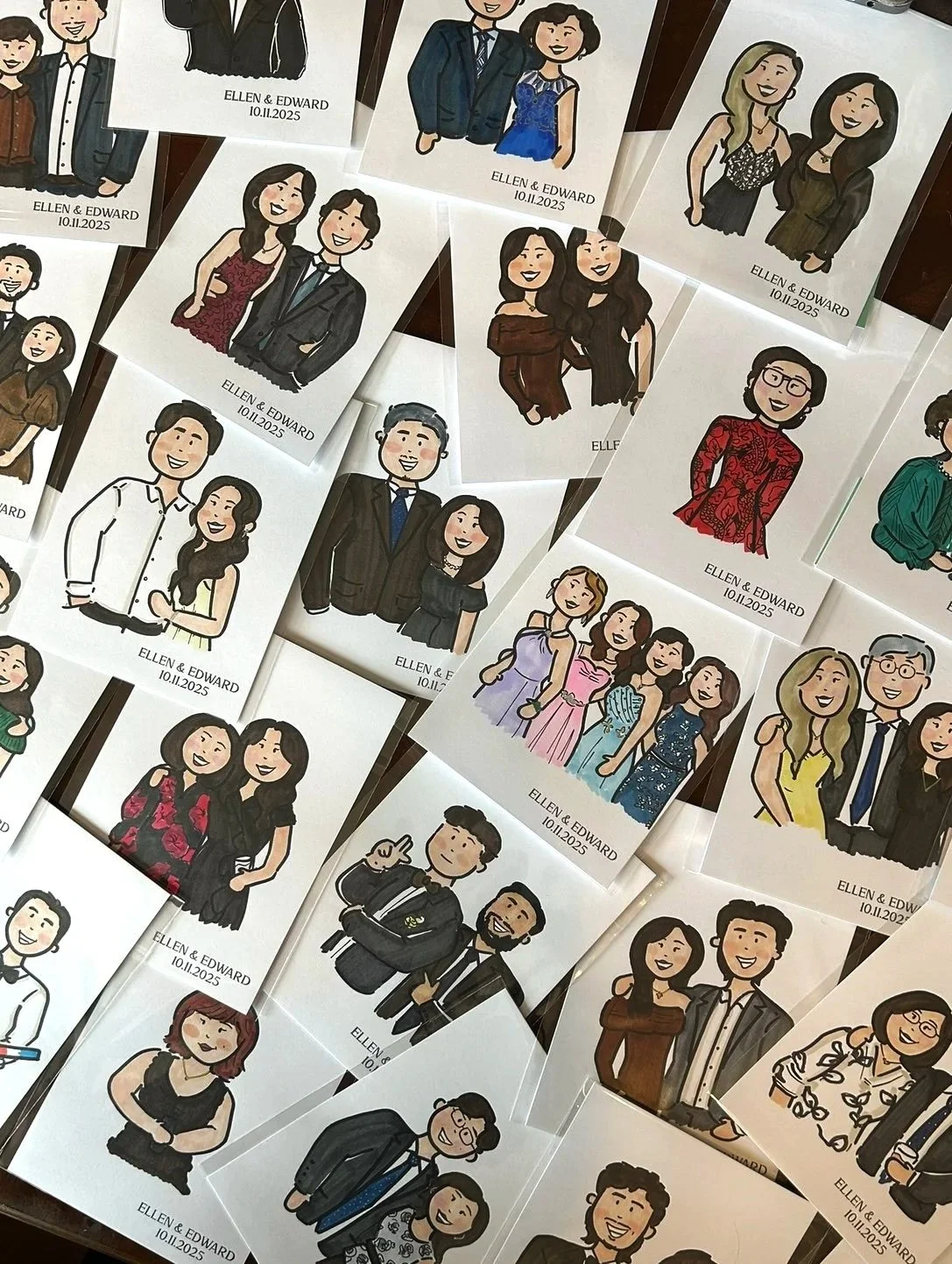 Before your big day, I create a custom couple portrait to display at your event. Something adorable for guests to enjoy as they walk in. I arrive early to set up and photograph your guests so each portrait is drawn with care and accuracy in my signature, cartoon style. During the celebration, I draw one portrait per guest. Every 5x7 portrait is sealed in a clear sleeve so your guests can take home the sweetest little memory.
